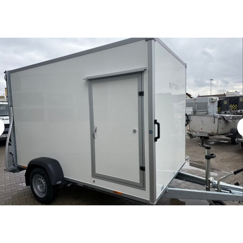 Kofferanhänger, Tieflader, Einachsanhänger, gebremst, Aufbau Plywood weiß beschichtet, Bodenplatte Siebdruck, Heckklappe mit Gasfedern klapp- u. schwenkbar, zul GG 1800 kg, Nutzlast ca. 1150 kg, Kasteninnenmaß 3050x1750x1900 mm, Seitentüre in FR rechts, Radstoßdämpfer für 100 km/h, 13-pol. Stecker